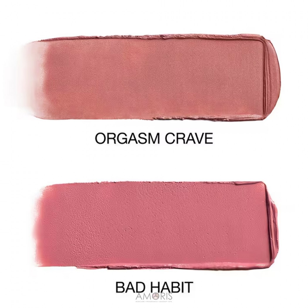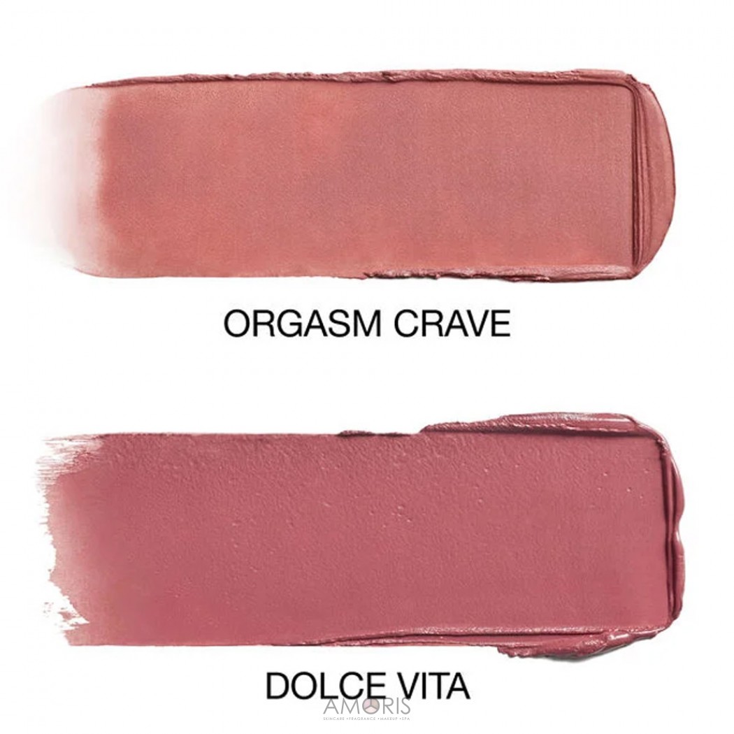 Orgasm Crave: Isodecyl Isononanoate, Silica, Octyldodecyl Stearoyl Stearate, Synthetic Wax, Isodecyl Neopentanoate, C12-15 Alkyl Benzoate, Mica, Synthetic Fluorphlogopite, Barium Sulfate, Illite, Limnanthes Alba (Meadowfoam) Seed Oil, Sorbitan Isostearate, Sorbitan Sesquioleate, Stearalkonium Hectorite, Prunus Persica (Peach) Kernel Oil, Ethylhexylglycerin, Tocopherol, Rheum Palmatum Root Extract, Tocopheryl Acetate, Isopropyl Titanium Triisostearate, Aluminum Hydroxide, Triethoxycaprylylsilane, Tin Oxide, Water/Aqua/Eau, Butylene Glycol, Phenoxyethanol, +/- May Contain: Red 40 Lake (CI 16035), Titanium Dioxide (CI 77891), Iron Oxides (CI 77491), Yellow 5 Lake (CI 19140), Iron Oxides (CI 77499), Blue 1 Lake (CI 42090)