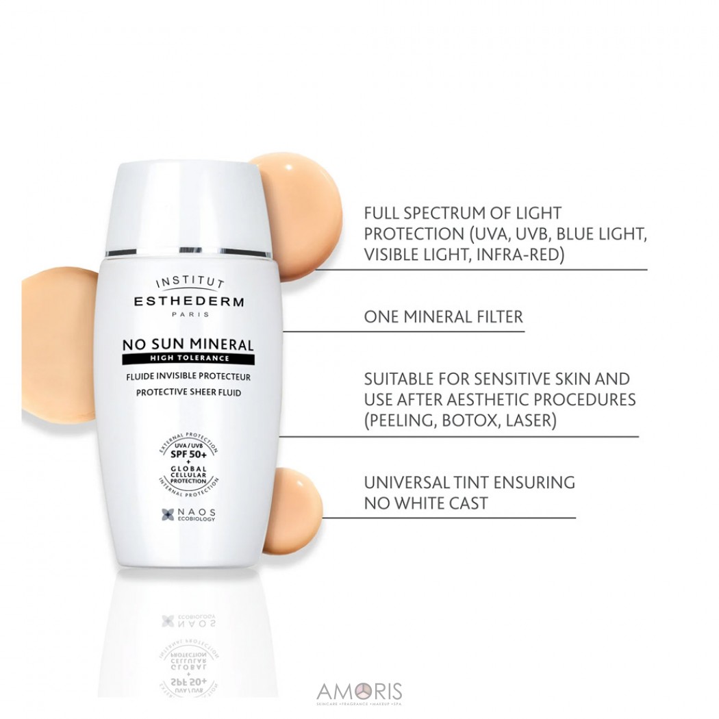 Institut Esthederm No Sun Mineral Sheer Fluid SPF 50+ — ультралёгкий тональный флюид с высокой минеральной защитой, разработанный для максимальной защиты кожи от солнечного излучения и выравнивания тона лица. Средство сочетает в себе эффективный уход, деликатное тонирование и очень высокий уровень защиты SPF 50+, обеспечивая комфорт даже для самой чувствительной кожи.