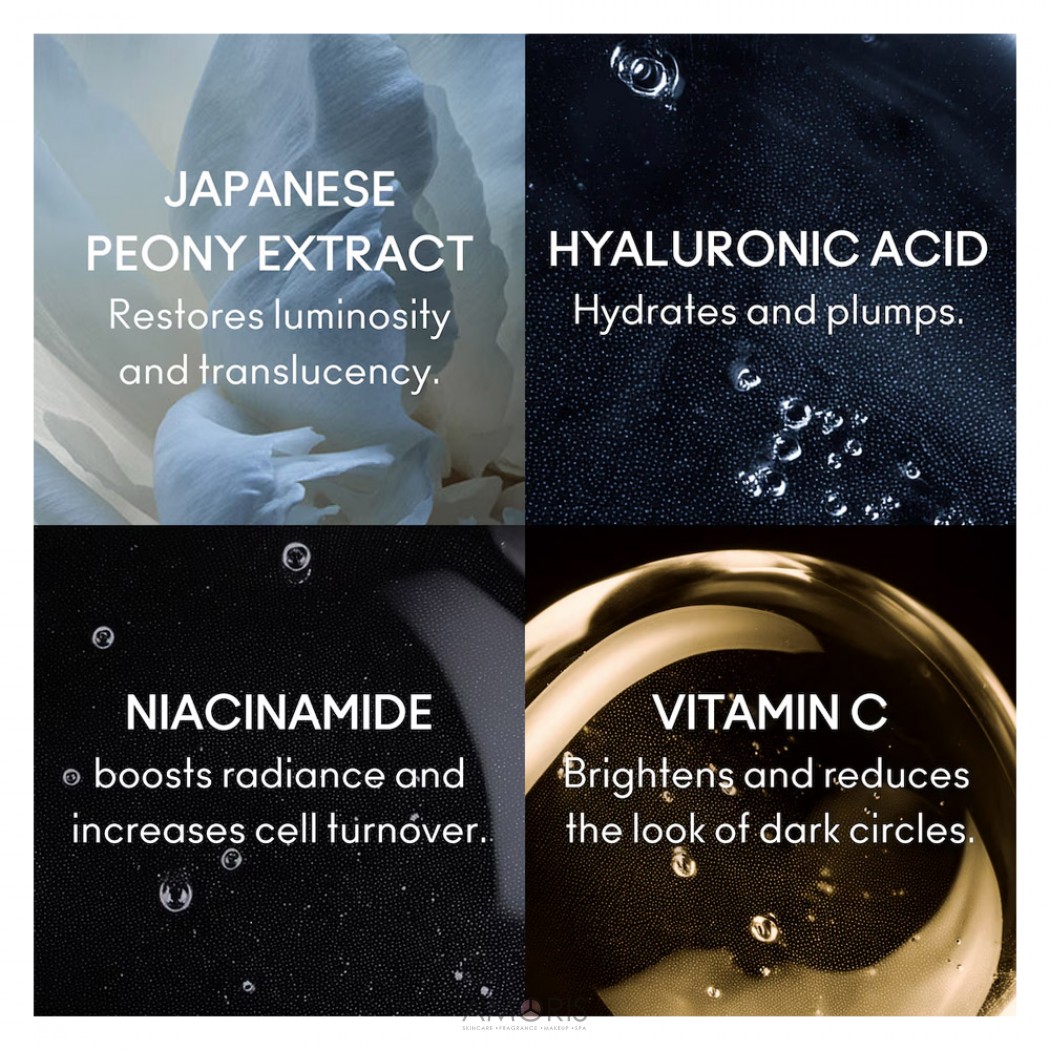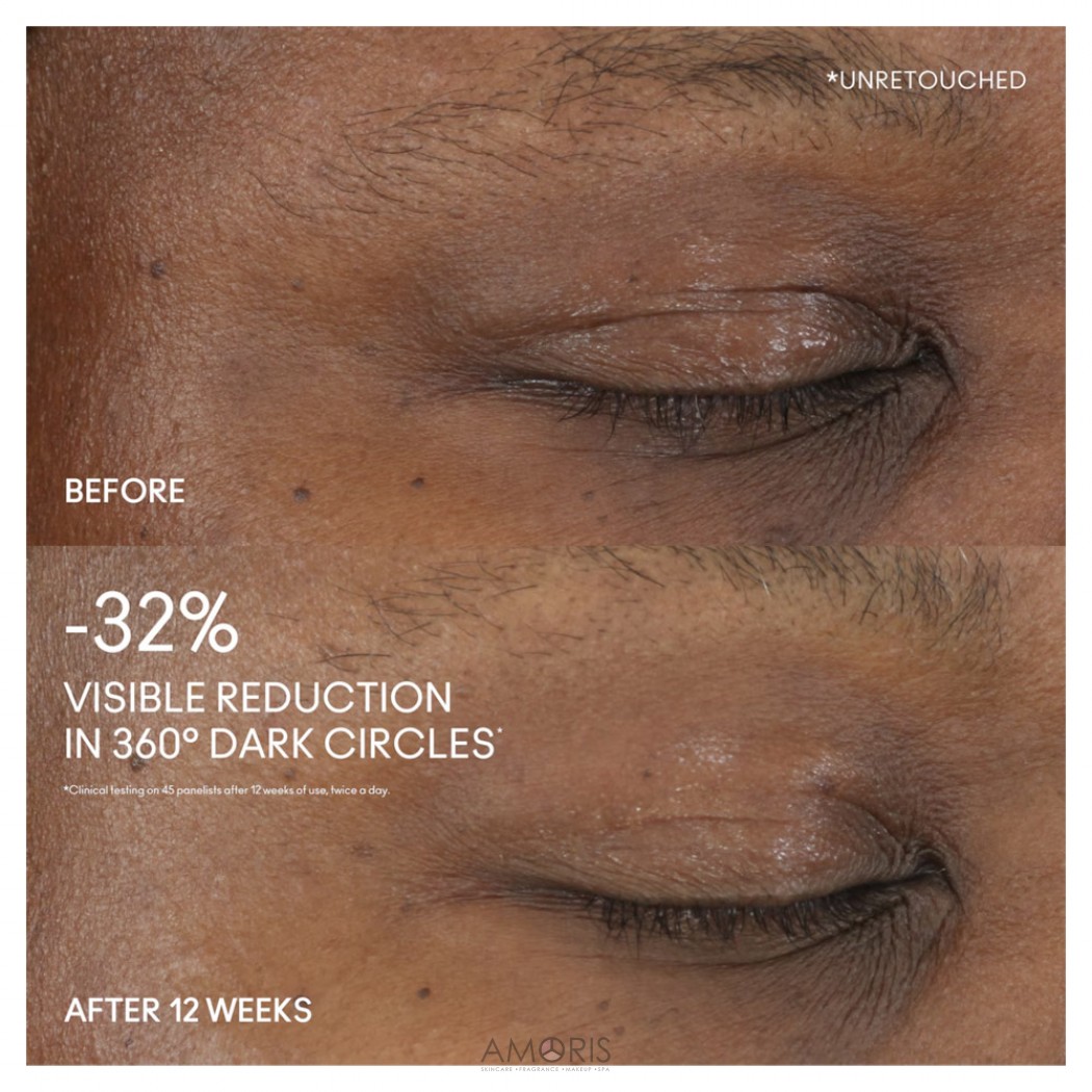 Формула направлена на уменьшение тусклости и придание коже более ровного и сияющего оттенка. Взгляд становится более открытым, а кожа — визуально более светлой и отдохнувшей.