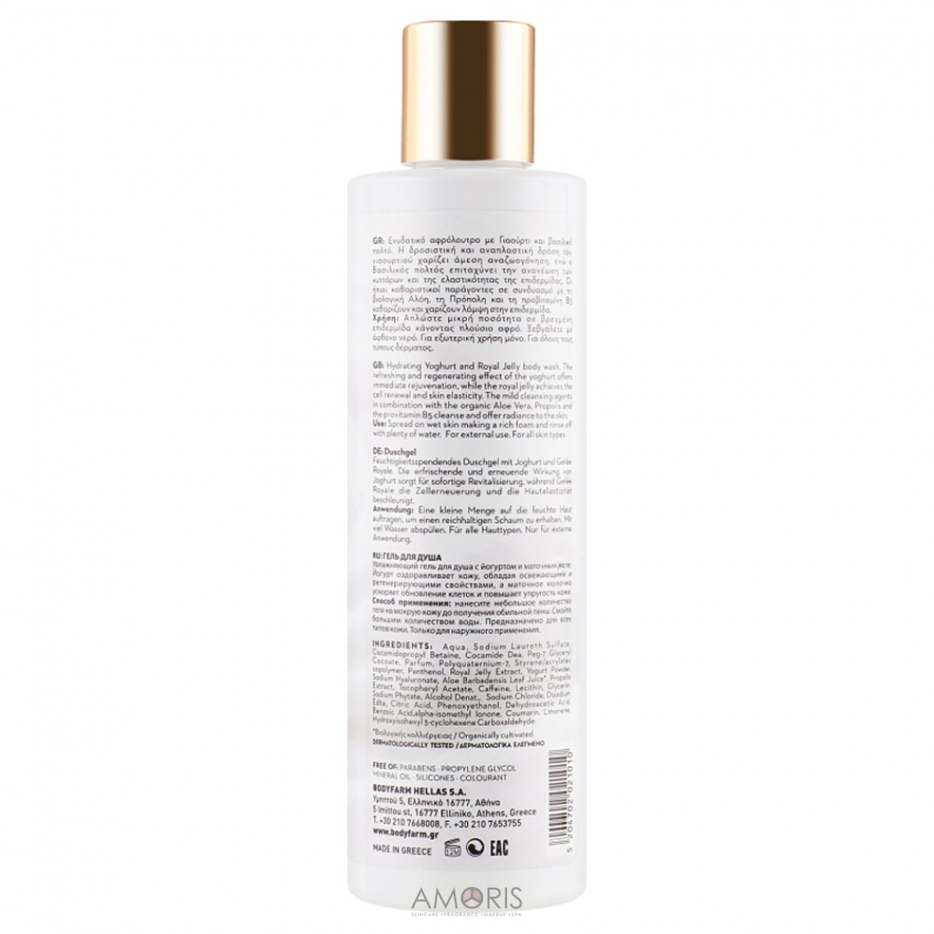 Майстри Bodyfarm створили поживний та зволожуючий комплекс, який полюбить ваша шкіра – грецький йогурт та маточне молочко. Складові йогурту - лактоза і білки - добре зволожують клітини і активують їх природне оновлення. Завдяки маточному молочку шкіра стає більш еластичною. Доповніть лазневі процедури гелем для душу Greek Yogurt & Royal Jelly, щоб відновити здорове сяйво та еластичність шкіри.